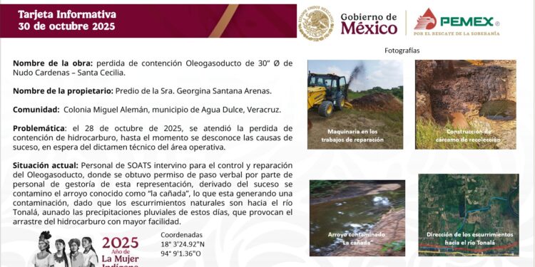 Buen día al 9933989844…🚩⚠️ ¡Fuga de crudo contamina río Tonalá en Agua Dulce; negligencia de MIRANDA/SSSTPA!; como se ha documentado aquí, los incidentes siguen a la alza en la Dirección de Exploración y Extracción (DEE antes PEP) de Ángel Cid Munguía por la fallida estrategia del licenciado en informática, Miguel Miranda Mendoza, subdirector de Seguridad, Salud en el Trabajo y Protección Ambiental (SSSTPA), mal llamado “Doctor Miranda”, pues no ostenta el título de doctorado, ya que los accidentes siguen y siguen por no tener implementado un sistema de SSPA, le siguen vendiendo espejitos a Ángel Cid Munguía, en la RDC-SSPA que se realiza cada 15 días y no se ven los resultados; esta vez se presentó un golpe en un oleogasoducto de 30″ por 101 km de longitud que va del Castaño a AT Santa Cecilia, lo que provocó un impacto ambiental de gran impacto por derrame de cerca de 5,000 metros cúbicos; según la tarjeta informativa del pasado 30 de octubre se trató de una “pérdida de contención en el nudo Cárdenas-Santa Cecilia a la altura del predio de la señora Georgina Santana Arenas en la colonia Miguel Alemán, de Agua Dulce, Veracruz, donde el personal de SOATS intervino para el control y reparación del oleogasoducto, donde se obtuvo permiso de paso verbal por parte de personal de gestoría de esta representación, derivado del suceso se contaminó el arroyo conocido como “La Cañada”, lo que está generando una contaminación, dado que los escurrimientos naturales son hacia el río Tonalá, aunado las precipitaciones pluviales de estos días, que provocan el arrastre del hidrocarburo con mayor facilidad; atención @Claudiashein @MarcelaVilleg15 @CNE_Mex @SENER_mx @GobiernoMX @FGRmexico @LuzElena_GE @ASF_Mexico @SCJN @STPS_mx @Tu_IMSS @SEMARNAT_mx @agencia_asea @CENAGAS_mx @IMPetroleo @SATMX @Hacienda_Mexico @BuenGobierno_mx @Centrofcrl #OIC #UIF #OmarReyesColmenares …Zas!!!