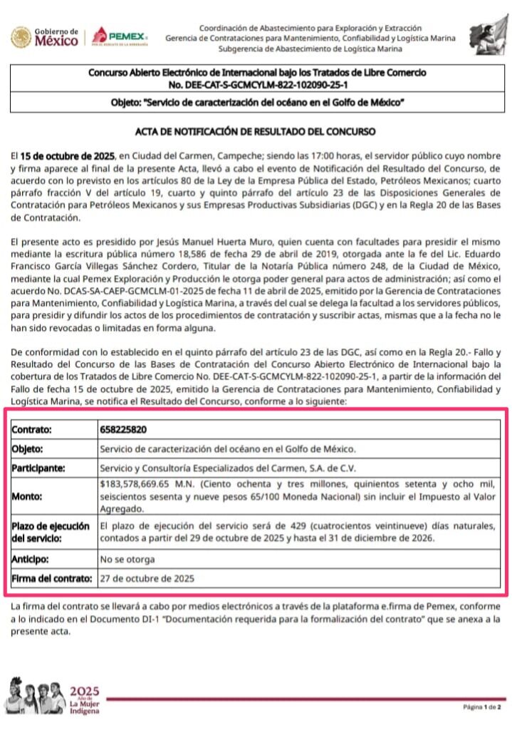 Denuncia al 9933989844… 🚩⚠️🌊💵 ¡Marea a favor de SCEC en Pemex; dedazo por 183 MDP para caracterización del Golfo!; Servicio y Consultoría Especializados del Carmen (SCEC), propiedad de Victoriano Agustín Domínguez Sánchez, Rogelio Uc Ríos y Agustín Romo Uc -con un juicio laboral encima- ganó la licitación DEE-CAT-S-GCMCYLM (María Isabel Segovia Magaña) 822-102090-25-1 de @Pemex para servicio caracterización del océano en el Golfo de México por 183,578,669.65 pesos con un plazo del 29 de octubre de 2025 hasta el 31 de diciembre de 2026; mal concurso desde la apertura de propuestas donde SCEC, no sólo fue la única oferta sino que @Pemex deliberadamente ocultó el monto propuesto, con lo que va en contra del principio de máxima transparencia señalado en los Artículos 46 y 51 de de la Disposiciones Generales de Contratación (DGC), los Artículos 134, 70 y 122 de la Ley General de Transparencia y Acceso a la Información Pública (LGTAIP); ahora con 7 contratos (EPN 1, AMLO 5 y Sheinbaum 1) por valor en conjunto de 530,989,362.29 pesos que SCEC firmó con @Pemex , 2 fueron exactamente para caracterización del océano en el Golfo de México: 1.- Contrato 648222818 para servicio de caracterización del océano en el Golfo de México por un monto de 232,265,375 pesos a un plazo del 4 de junio de 2022 al 31 de diciembre de 2024; 2.- Contrato 648220801 para servicio de caracterización del océano en el Golfo de México por un monto de 60,000,000 pesos con vigencia del 4 de marzo al 31 de diciembre de 2020; 3.- Contrato 648024605 para adquisición de gráficas y plumillas para registradores de presión y flujo por un monto de 5,626,802.44 pesos vigente del 28 de junio de 2024 al 30 de junio de 2025; 4.- Contrato 645017807 para servicio para realizar auditorías ambientales, diagnósticos ambientales y verificaciones del cumplimiento de planes de acción en las instalaciones de la Subdirección de Producción Bloques Sur vigente del 23 de noviembre de 2017 al 30 de junio de 2018 por 26,970,220 pesos; 5.- Contrato 4800031455 para mantenimiento mayor a torres estructurales de microondas a un plazo del 1 de mayo de 2021 al 4 de mayo de 2021 por 22,107,900 pesos; 6.- Contrato 648221819 para servicio de cursos de interpretación de los requisitos de la norma ISO 9001: 2015 del sistema de gestión de la calidad e interpretación de la norma ISO 22000: 2018 del sistema de gestión de la inocuidad de los alimentos, que integra el Programa de Capacitación de la Gerencia de Servicios de Soporte y Logística Marina a un plazo del 20 de julio de 2021 al 12 de marzo de 2021 por 440,395.2 pesos; la asunto es como pasó la Debida Diligencia ya que existe el expediente 10/22-2023/JL-II de juicio ordinario en materia laboral promovido por Narahaí Ponce Bernardo en contra de varios: SCEC, Servicios de Mantenimiento y Logística del Golfo de Claudia del Socorro Martínez Gómez, y Empowermet Coach de Jesús Cristobal Ochoa Peña; atención @Claudiashein @MarcelaVilleg15 @CNE_Mex @SENER_mx @GobiernoMX @FGRmexico @LuzElena_GE @ASF_Mexico  @SCJN @STPS_mx @Tu_IMSS @SEMARNAT_mx @agencia_asea @CENAGAS_mx @IMPetroleo @SATMX @Hacienda_Mexico @BuenGobierno_mx @Centrofcrl #OIC #UIF #OmarReyesColmenares …Zas!!!
