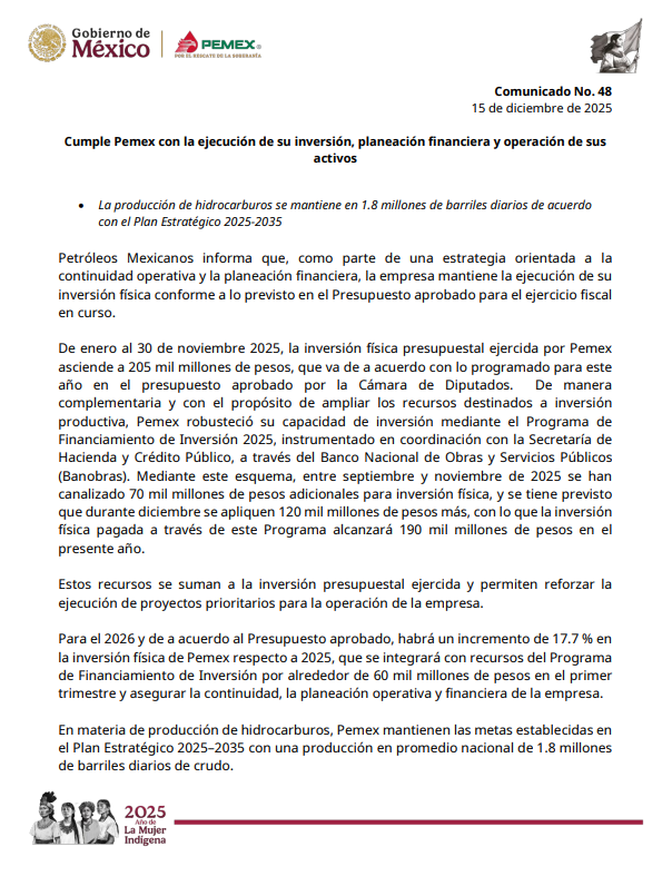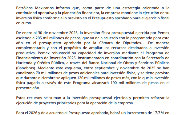 Denuncia al 9933989844…🚩⚠️ ¡Pemex anuncia inversión física por 120 MMDP en diciembre 2025!; la petrolera nacional informa que de enero al 30 de noviembre 2025, la inversión física presupuestal ejercida por @Pemex asciende a 205 mil millones de pesos, que va de a acuerdo con lo programado para este año en el presupuesto aprobado por la @Mx_Diputados ; de manera complementaria y con el propósito de ampliar los recursos destinados a inversión productiva, @Pemex robusteció su capacidad de inversión mediante el Programa de Financiamiento de Inversión 2025, instrumentado en coordinación con la Secretaría de Hacienda y Crédito Público, a través de @Banobras_mx ; mediante este esquema, entre septiembre y noviembre de 2025 se han canalizado 70 mil millones de pesos adicionales para inversión física, y se tiene previsto que durante diciembre se apliquen 120 mil millones de pesos más, con lo que la inversión física pagada a través de este Programa alcanzará 190 mil millones de pesos en el presente año; estos recursos se suman a la inversión presupuestal ejercida y permiten reforzar la ejecución de proyectos prioritarios para la operación de la paraestatal; para el 2026 y de a acuerdo al Presupuesto aprobado, habrá un incremento de 17.7 % en la inversión física de @Pemex respecto a 2025, que se integrará con recursos del Programa de Financiamiento de Inversión por alrededor de 60 mil millones de pesos en el primer trimestre y asegurar la continuidad, la planeación operativa y financiera de la paraestatal; en materia de producción de hidrocarburos, @Pemex mantienen las metas establecidas en el Plan Estratégico 2025-2035 con una producción en promedio nacional de 1.8 millones de barriles diarios de crudo; atención @Claudiashein @MarcelaVilleg15 @CNE_Mex @SENER_mx @GobiernoMX @FGRmexico @LuzElena_GE @ASF_Mexico  @SCJN @STPS_mx @Tu_IMSS @SEMARNAT_mx @agencia_asea @CENAGAS_mx @IMPetroleo @SATMX @Hacienda_Mexico @BuenGobierno_mx @Centrofcrl #OIC #UIF #OmarReyesColmenares …Zas!!!